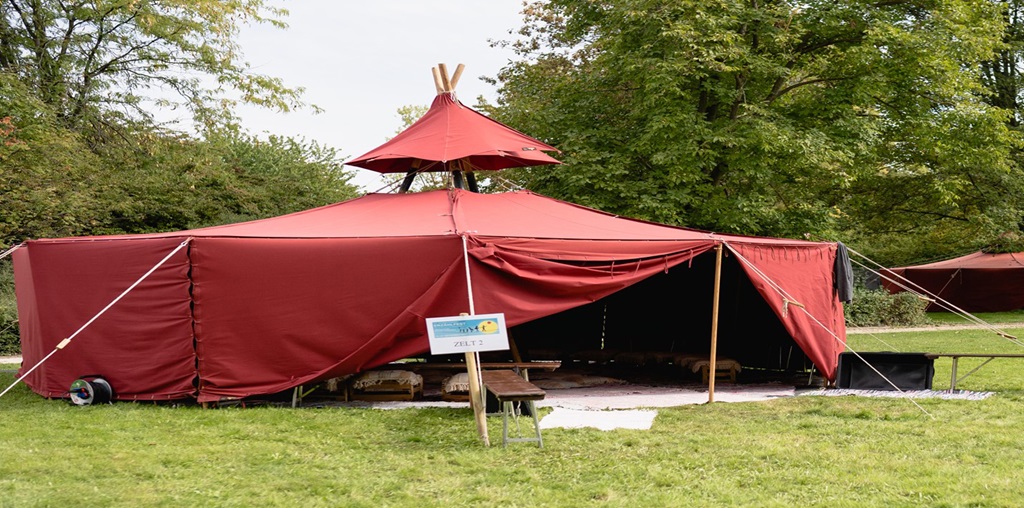 Eine rote Feuerjurte als Erzählzelt präsentieren das Kino im Stadtpark, Robin Book, der DGB Ortsverband und der KulturOrt Erwitte beim Stadtfest am 27. September.Eine rote Feuerjurte als Erzählzelt, ausgestattet mit dichtem, gemütlichem Teppichbelag zum Sitzen auf dem Boden, vielen Kissen und Sitzbänken ist die gemeinsame Attraktion von Robin Book, Kino im Stadtpark, DGB Ortsverband und KulturOrt Erwitte beim Stadtfest.