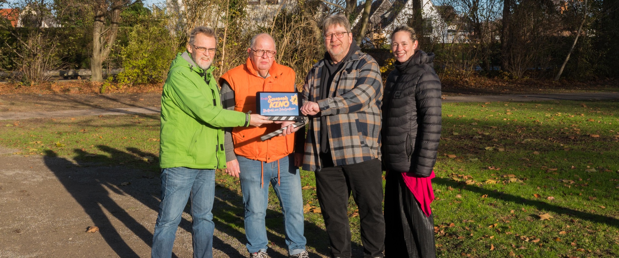 Staffelübergabe - zum Sommerkino passend mit einer Synchronklappe - vom Verein Robin Book zur Initiative «Kino im Stadtpark» mit (von links) Johannes Plaßmann, Michael Wiesner, Holger Schild und Kristin Objartel."Staffelübergabe" beim Sommerkino