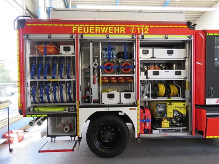 ausgestattet mit einer Feuerlösch- kreiselpumpe Schlingmann S2000 (FPN 10-2000), einem Lösch-wasserbehälter 2.000 l und LED-Umfeldbeleuchtung mit einem pneumatischen Lichtmast mit vier