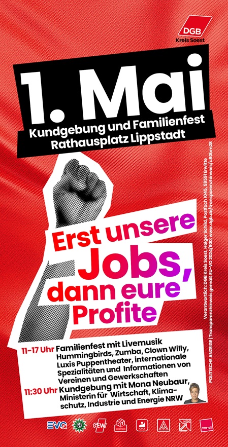 “Erst unsere Jobs, dann eure Profite” ist unser Motto zum 1. Mai 2026. Wir Gewerkschaften sind die Schutzmacht der Beschäftigten und kämpfen jeden Tag um jeden Job. Jobsicherheit hat für uns höchste Priorität. Seid dabei – gemeinsam sind wir unschlagbar!